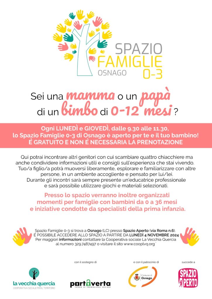 Ogni LUNEDÌ e GIOVEDÌ, dalle 9.30 alle 11.30, lo Spazio Famiglie 0-3 di Osnago è aperto per te e il tuo bambino!