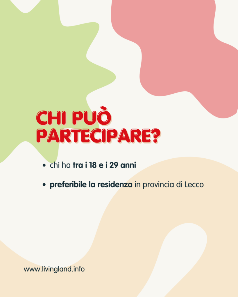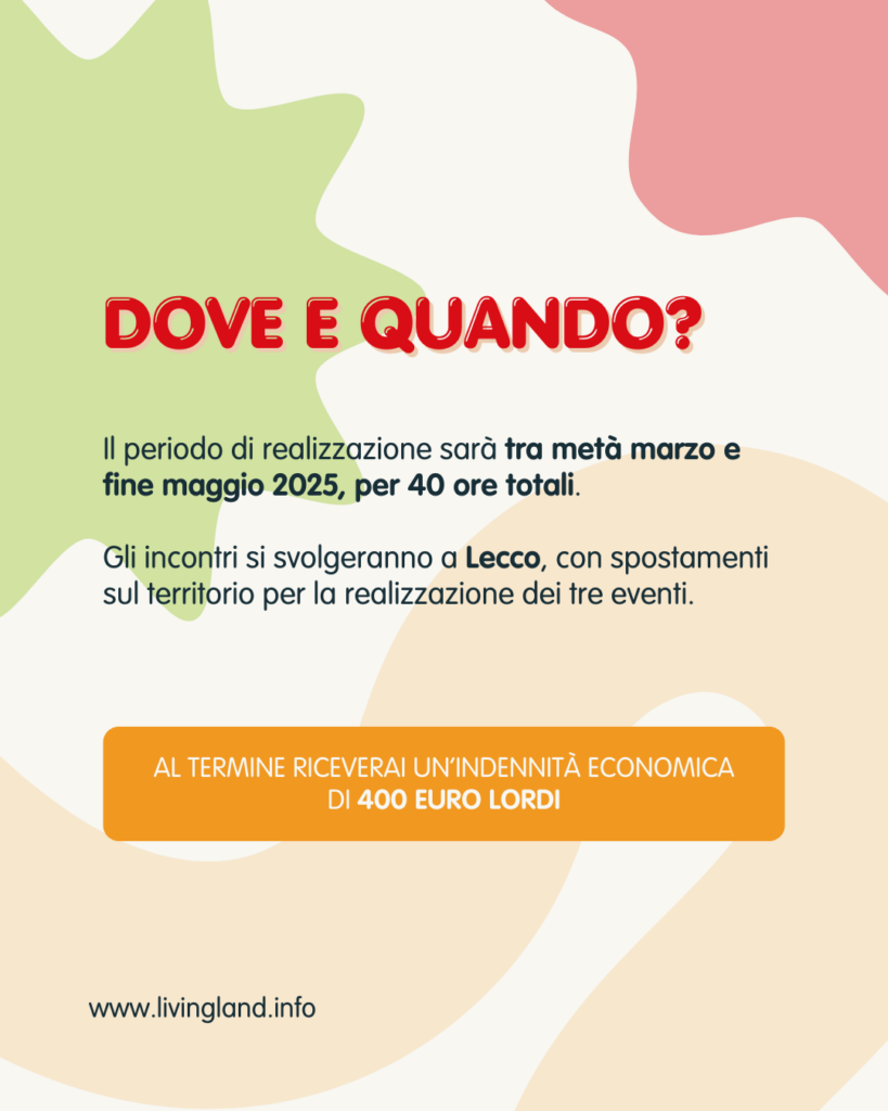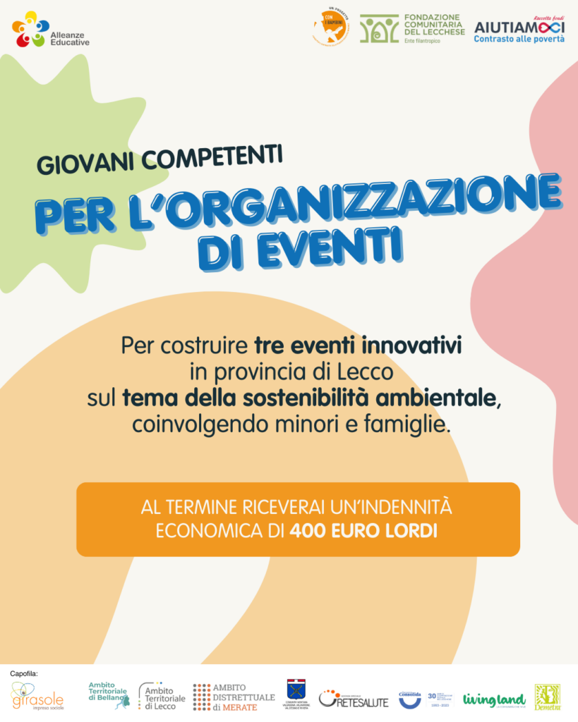 Accompagnato da ESPERTI del settore, parteciperai ad un percorso di gruppo con altri giovani dove mettere in comune IDEE e COMPETENZE, per costruire tre EVENTI innovativi in provincia di Lecco. Il tema centrale degli eventi sarà l’attenzione alla sostenibilità ambientale e coinvolgerà minori e famiglie in attività significative e divertenti.