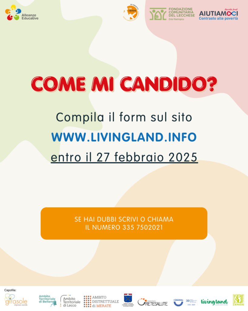 L’iniziativa è organizzata all’interno di Alleanze Educative, un progetto selezionato e finanziato da Con i Bambini nell’ambito del Fondo per il contrasto della povertà educativa minorile e Fondazione Comunitaria del Lecchese e Fondo Aiutiamoci in collaborazione con Ambiti di Lecco, Bellano e Merate, Consorzio Consolida, Sineresi, La Vecchia Quercia, La Grande Casa, Paso, Liberi sogni, Caritas Ambrosiana, Casa don Guanella, Fondazione Somaschi, Comunità via Gaggio e Casa dei Ragazzi I.A.M.A. Capofila del progetto Impresa Sociale Girasole.