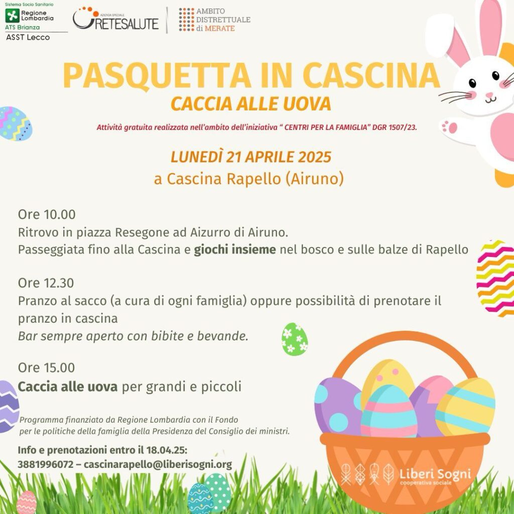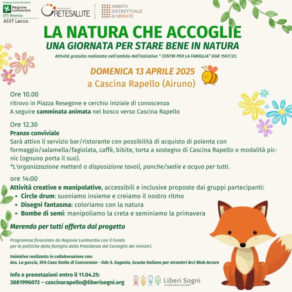 Continua la rassegna “Famiglie in cascina” – giornate immersive nella natura di Cascina Rapello (Aizurro di Airuno) realizzate nell’ambito del progetto RISE-RetI Senza Età dei Nuovi Centri per la Famiglia ex D.G.R. 1507/2023 e DDUO n. 4612/2024 promosso da Retesalute e finanziato da Regione Lombardia e ATS Brianza.