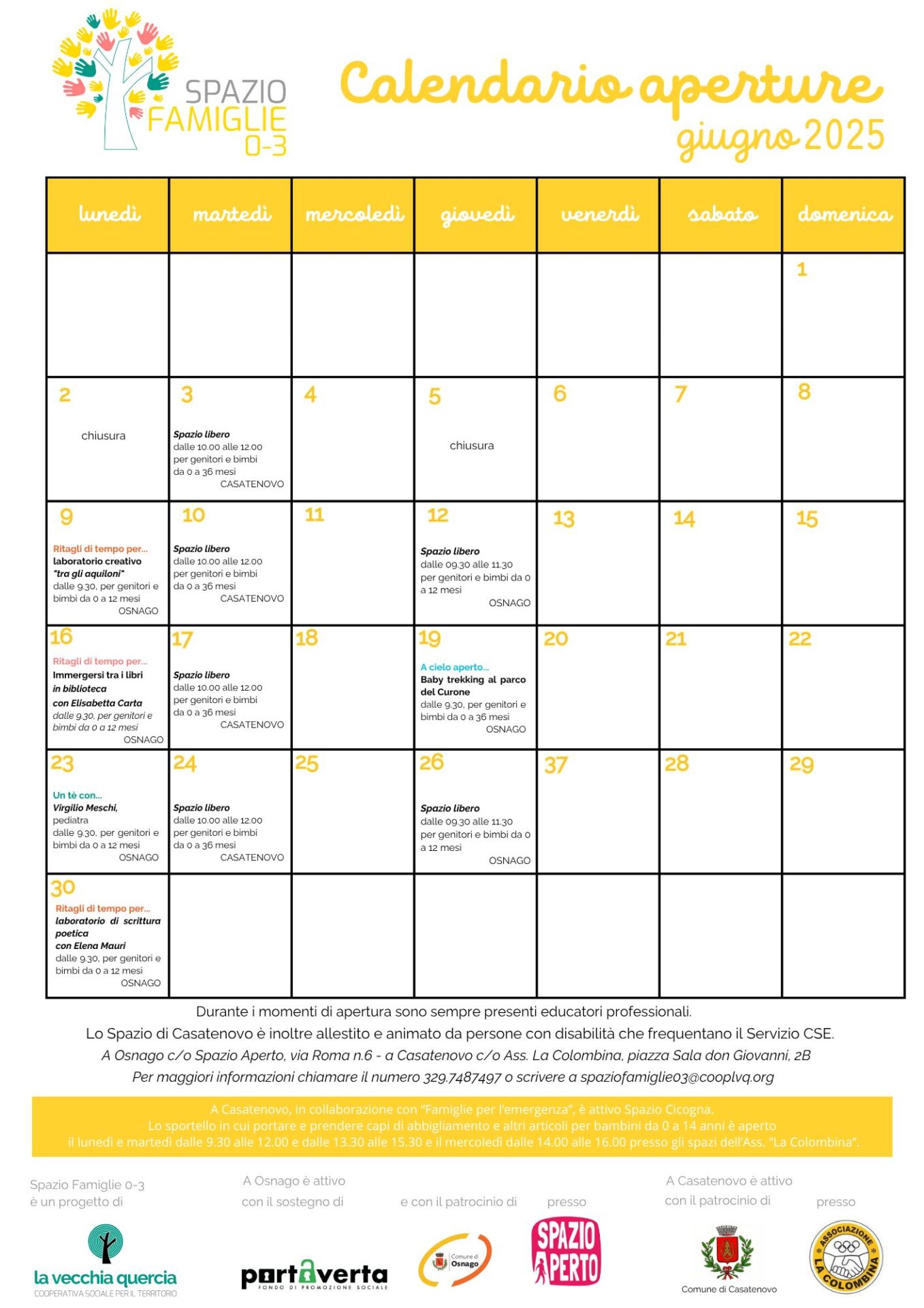 Anche a Giugno, un ricco calendario di iniziative negli Spazi Famiglie 0-3 , gli spazi ad accesso libero e gratuito attivati dalla nostra cooperativa a Osnago e a Casatenovo, in cui le famiglie, con i loro bambini, si possono incontrare per passare del tempo insieme, vivere esperienze di socialità e gioco in un ambiente protetto e accogliente, ma anche partecipare a momenti di incontro ed esperienze formative sulle tematiche della prima infanzia, condotti da specialisti del settore e organizzati in collaborazione con associazioni e realtà del territorio.