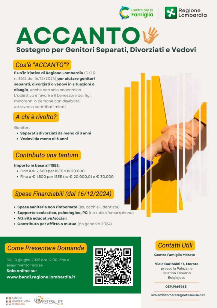 È un’iniziativa di Regione Lombardia (D.G.R. n. 3612 del 16/12/2024) finalizzata a sostenere i genitori in condizione di separazione, divorzio o vedovanza che si trovano in situazioni di disagio, anche non esclusivamente economico. Il contributo è destinato a favorire il benessere dei figli minorenni o maggiorenni con disabilità, attraverso misure di supporto alla genitorialità e spese familiari.