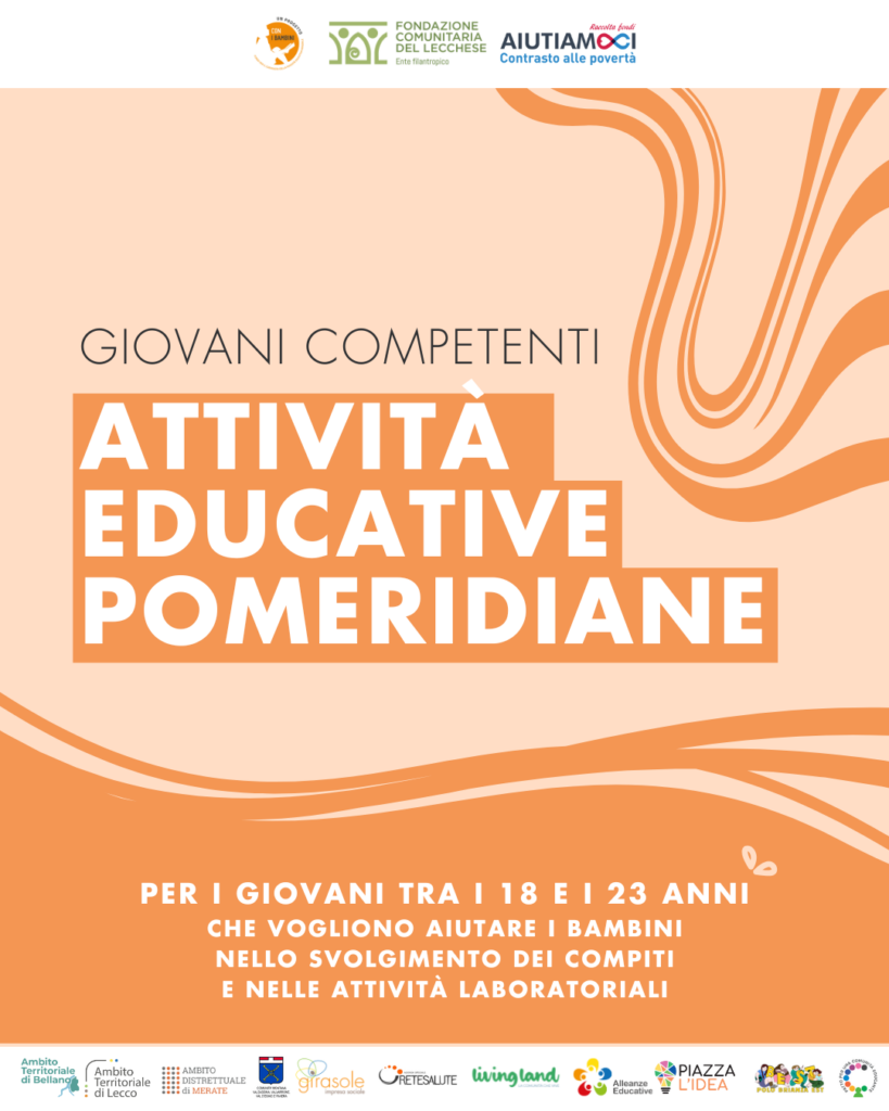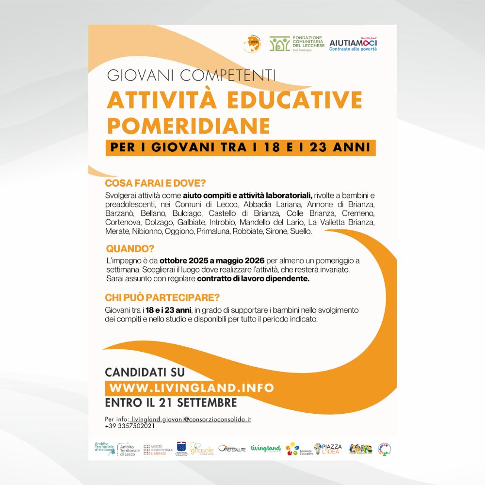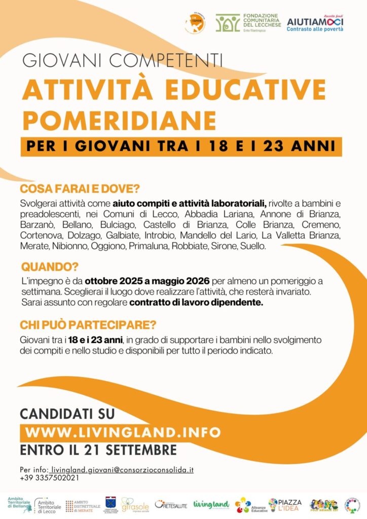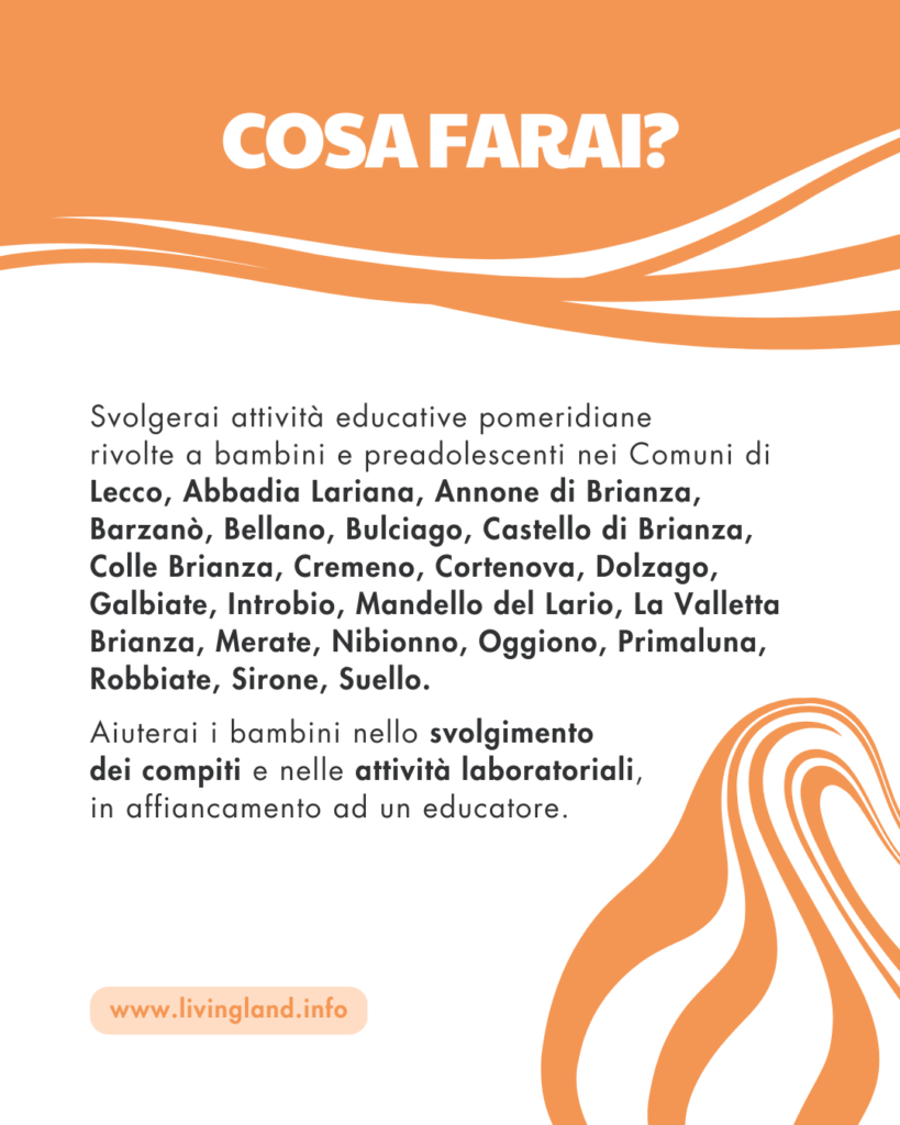 I giovani selezionati saranno impegnati in attività educative pomeridiane rivolte a bambini e preadolescenti che si svolgeranno nei Comuni di Lecco, Abbadia Lariana, Annone di Brianza, Barzanò, Bellano, Bulciago, Castello di Brianza, Colle Brianza, Cremeno, Cortenova, Dolzago, Galbiate, Introbio, Mandello del Lario, La Valletta Brianza, Merate, Nibionno, Oggiono, Primaluna, Robbiate, Sirone, Suello.
