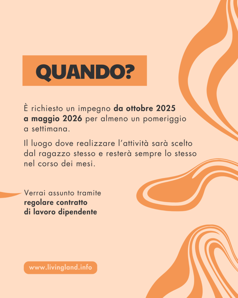È richiesto un impegno da ottobre 2025 a maggio 2026 per almeno un pomeriggio a settimana. Il luogo dove realizzare l’attività sarà scelto dal ragazzo stesso e resterà sempre il medesimo nel corso dei mesi.