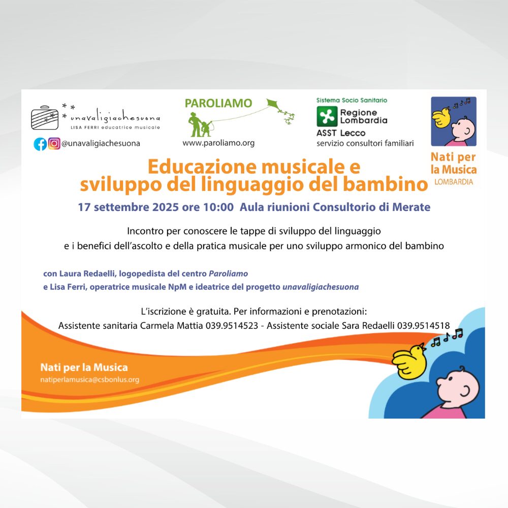 Mercoledì 17 settembre 2025, alle ore 10:00, presso l’Aula Flunioni Consultorio di Merate si terrà un incontro informativo organizzato da ParoliAMO e Nati per la Musica Lombardia. L’evento esplorerà le tappe dello sviluppo del linguaggio nei bambini e i benefici dell’ascolto e della pratica musicale per una crescita armoniosa.
