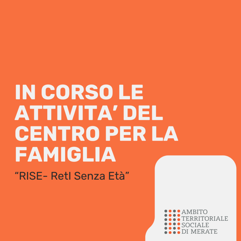 Il Centro per la Famiglia “RISE-RetI Senza Età” è un progetto finanziato con risorse del Fondo Nazionale per le Politiche della Famiglia – annualità 2024 (D.M. 23/12/2024), a valere sull’Avviso regionale D.G.R. n. 4431/2025 e del D.D.U.O. n. 9785/2025. L’Ambito Territoriale Sociale di Merate, attraverso l’ente strumentale Azienda Speciale Retesalute, partecipa al progetto in qualità di ente capofila, in partenariato con Fondazione Don Caccia, Cooperativa Sociale Liberi Sogni, Cooperativa Sociale La Vecchia Quercia, ASD Monsereno No Limits E.T.S. Nel contesto del Centro per la Famiglia “RISE-RetI Senza Età”, sono in corso le seguenti attività: