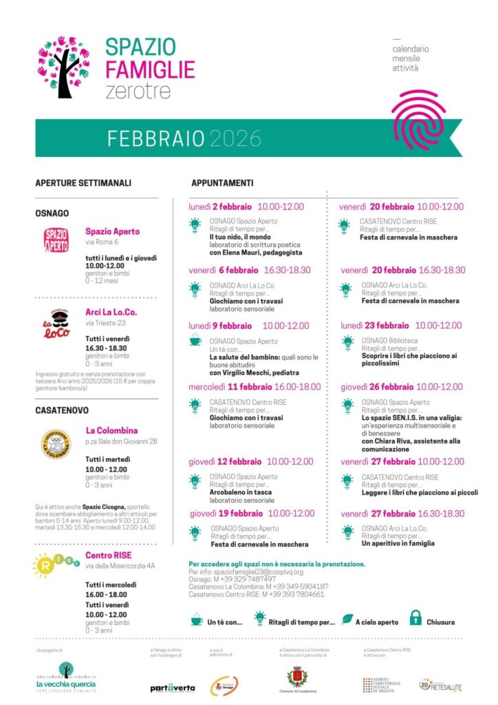 Siamo felici di presentarvi il nuovo calendario delle attività di febbraio 2026 nei Centro Famiglie di Osnago e Casatenovo!