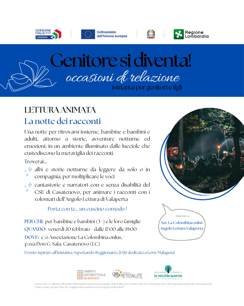 Lettura animata “La notte dei racconti”: Venerdì 20 febbraio 2026 dalle ore 17.00 alle 19.00, presso c/o Associazione La Colombina onlus p.zza Don G. Sala, Casatenovo (LC), si terrà una serata di lettura animata, quale occasione per immergersi in storie notturne da leggere da soli o in compagnia e assistere all’animazione di racconti tenuta dai volontari dell’Angolo Lettura di Valaperta.