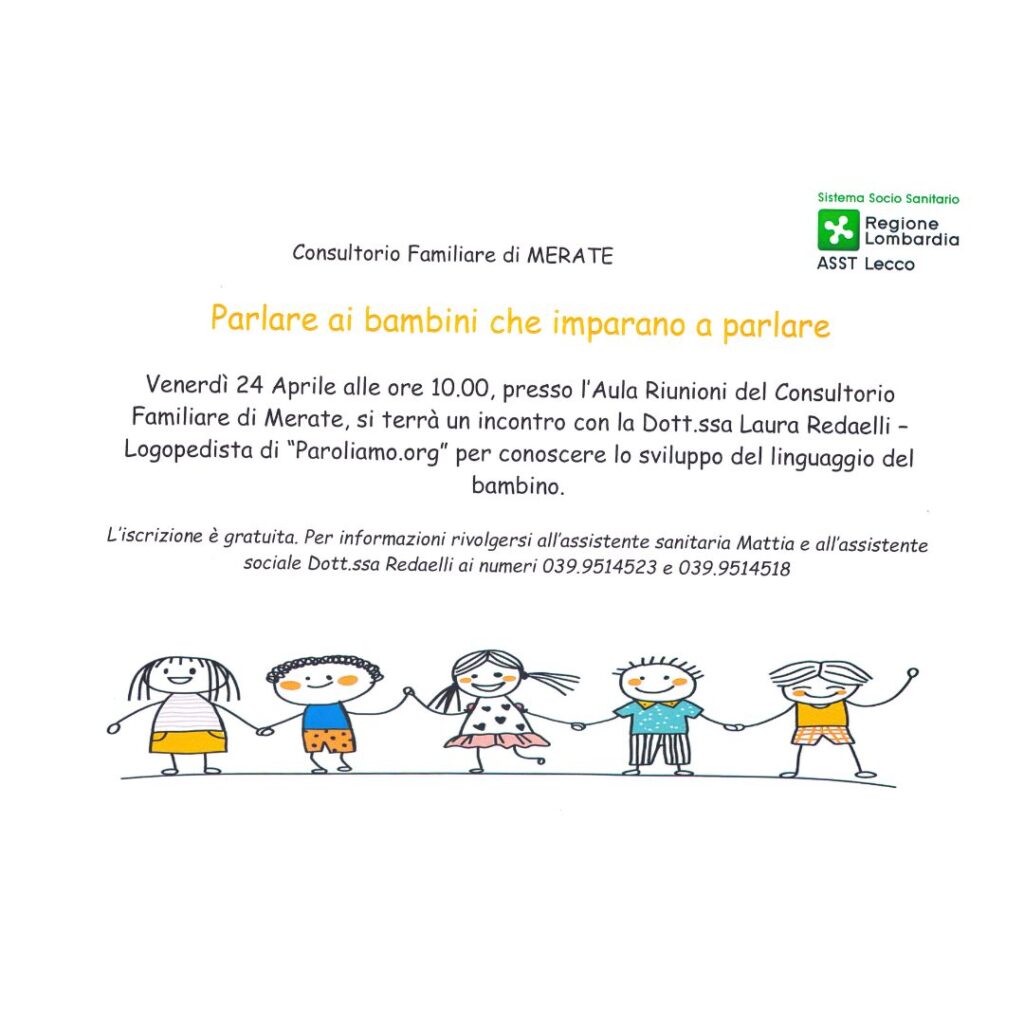 Il Consultorio Familiare di Merate organizza un incontro dedicato ai genitori e a chi si prende cura dei più piccoli, dal titolo “Parlare ai bambini che imparano a parlare”, in programma venerdì 24 aprile alle ore 10.00 presso l’Aula Riunioni del Consultorio.