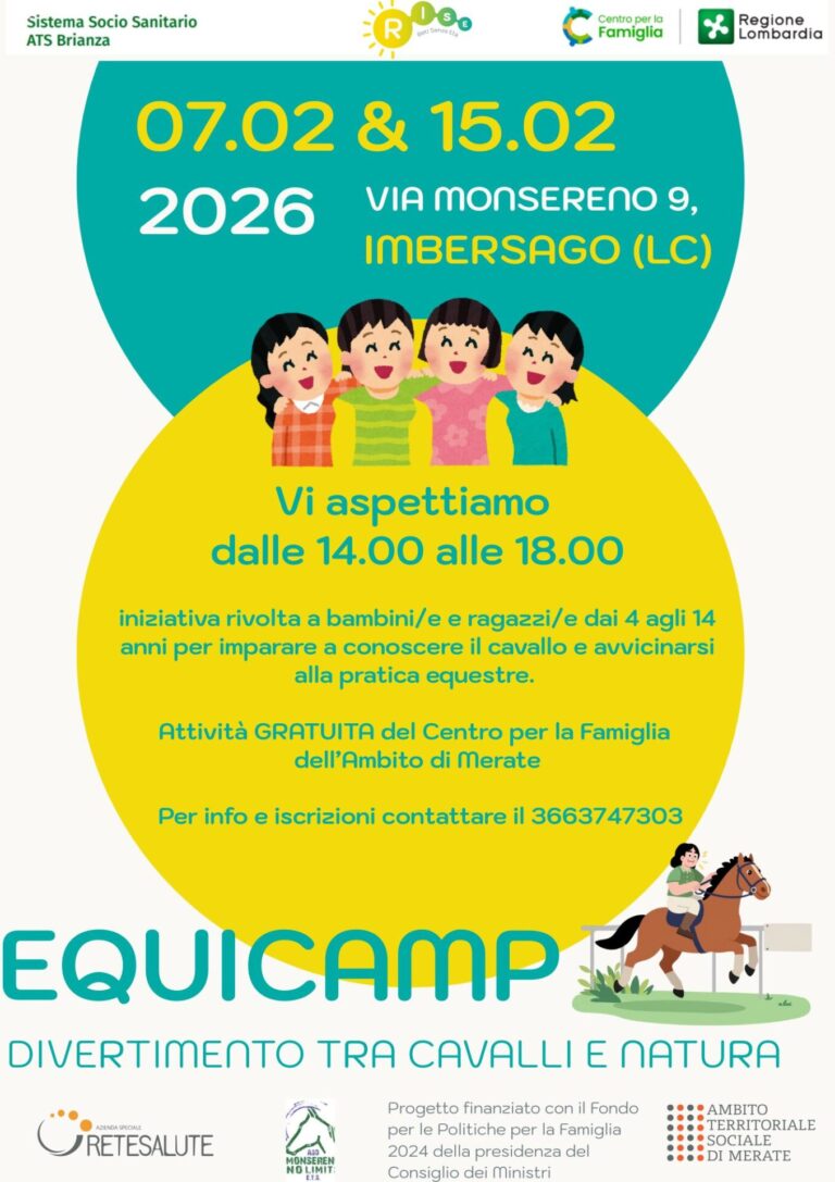Sabato 7 e 15 febbraio 2026, presso Via Monsereno 9, Imbersago (LC), vi aspettiamo dalle 14.00 alle 18.00 per due pomeriggi gratuiti dedicati a bambini e ragazzi dai 4 ai 14 anni. Un’esperienza educativa e coinvolgente per conoscere il cavallo,…