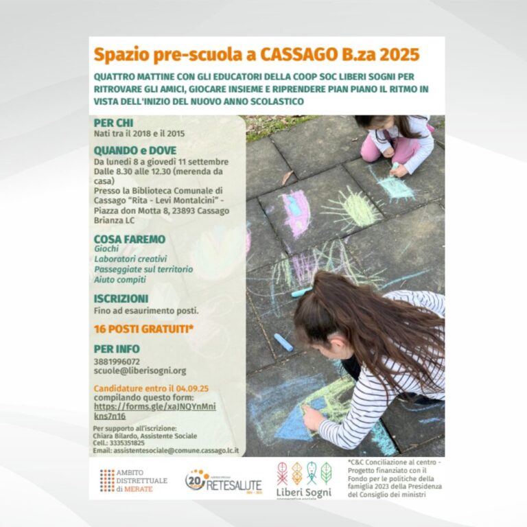 QUATTRO MATTINE CON GLI EDUCATORI DELLA COOP SOC LIBERI SOGNI PERRITROVARE GLI AMICI, GIOCARE INSIEME E RIPRENDERE PIAN PIANO IL RITMO INVISTA DELL’INIZIO DEL NUOVO ANNO SCOLASTICO. A partire dall’8 settembre, la Coop Soc Liberi Sogni organizza uno spazio pre-scuola…